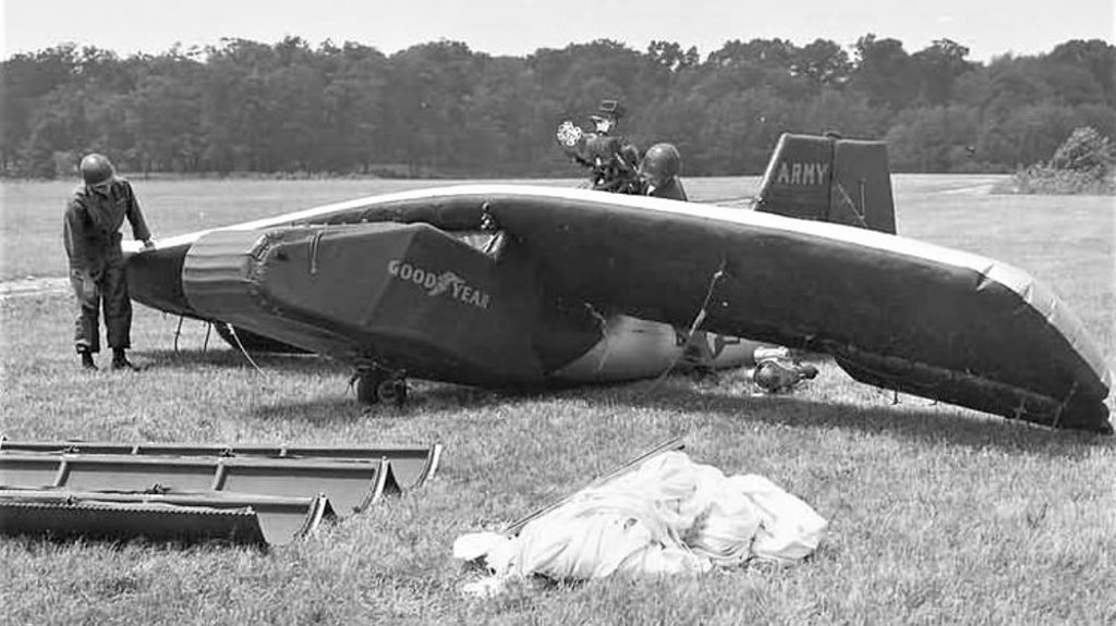 The Goodyear Inflatoplane was one of the strangest aviation experiments of the 1950s: a fully inflatable aircraft made of rubberized fabric stretched over a collapsible frame. It could be packed into the trunk of a vehicle, assembled quickly, and filled with air like an oversized balloon before takeoff. Once airborne, it performed surprisingly well, reaching altitudes up to 16,000 feet and speeds over 70 mph.